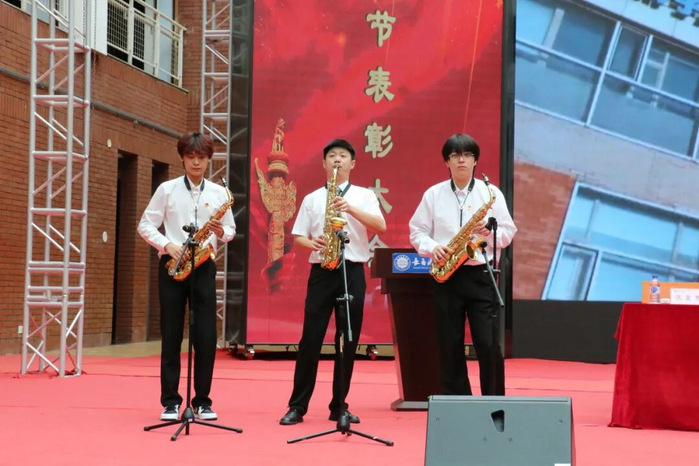 会上,师生同台表演了配乐诗朗诵《灯塔》、萨克斯合奏《世界赠予我》。