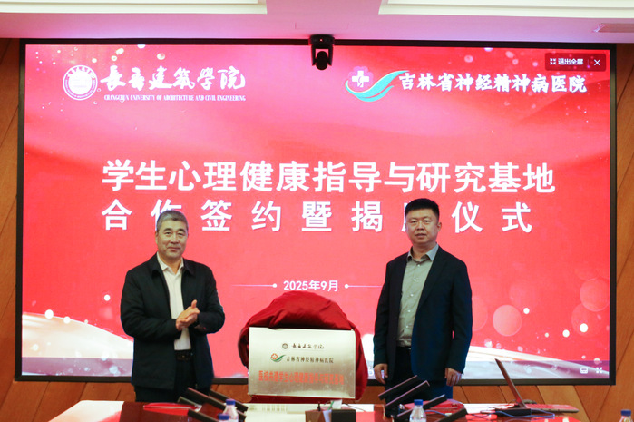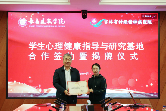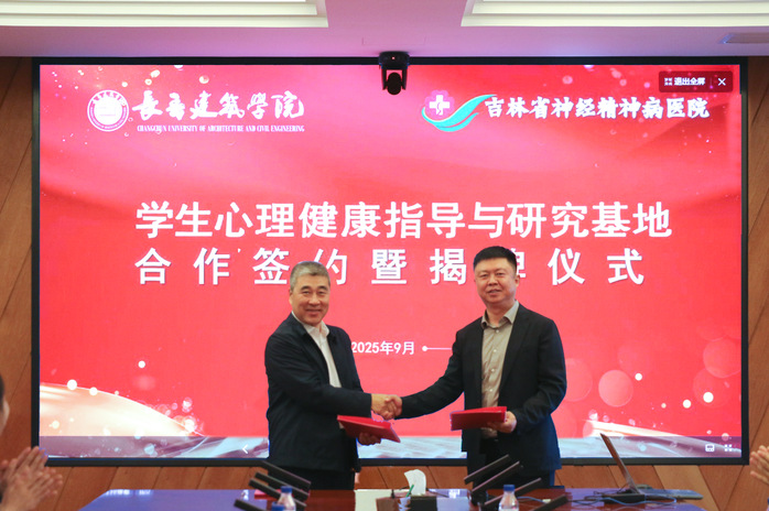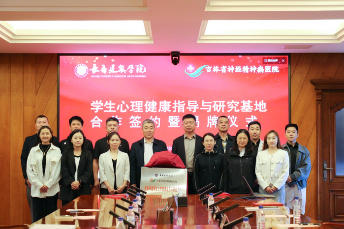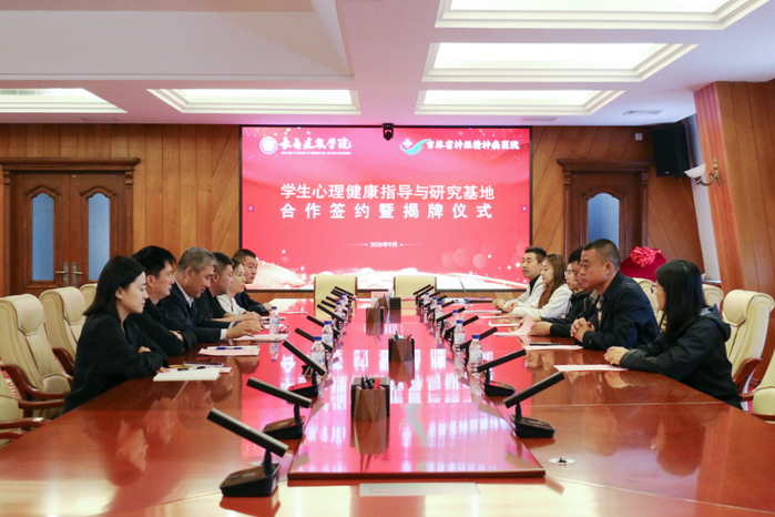 为贯彻落实教育部关于加强高校学生心理健康教育工作的相关要求,整合高校教育资源与医疗专业优势,构建“预防-筛查-干预-转介”的全链条学生心理健康服务模式,9月24日上午,学校与吉林省神经精神病医院“医校共建学生心理健康指导与研究基地”合作签约暨揭牌仪式在行政楼六楼会议室举行。