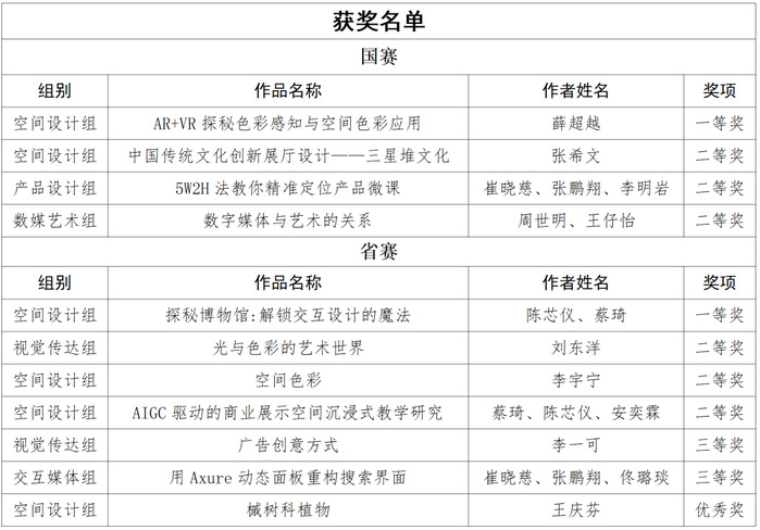 近日,第八届全国数字创意教学技能大赛评选结果揭晓,学校教师团队成绩斐然,共荣获国家级奖项4项,其中一等奖1项、二等奖3项;荣获省级奖项7项,其中一等奖1项,二等奖3项,三等奖2项,优秀奖1项。同时,学校荣获优秀组织奖。