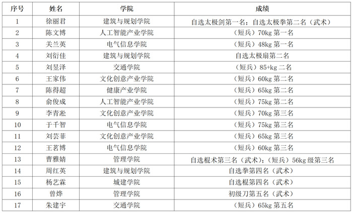 在三天的比赛中,学校武术队沉着应战、勇于争先,凭过硬的功底和稳定的发挥再创佳绩,荣获大学甲组3金6银5铜的优异成绩,另获第四名2项、第五名2项。