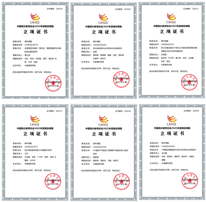 为助力分类管理改革平稳推进,促进特色发展与人才培养质量提升,中国民办教育协会组织了2025年度规划课题的申报工作。根据《中国民办教育协会课题管理办法(2025年修订)》和《关于申报中国民办教育协会2025年度规划课题的通知》规定,经协会组织专家评审、推荐立项,最终我校有6项课题立项“2025年度中国民办教育协会规划课题(青年课题)”。