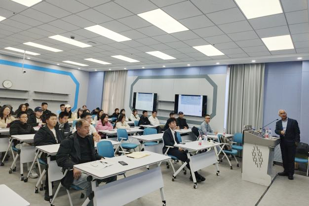 28日上午,第三场“基于人工智能的进化计算(EC)技术及应用介绍”讲座正式开始。凯沙夫・达哈尔教授先是介绍了进化计算的基本概念和发展历程,接着详细讲解了它与人工智能结合后在不同领域的应用情况。他列举了在智能制造中优化生产流程、在大数据分析中进行高效聚类等实际案例,让大家对进化计算技术的应用有了更清晰的认识。在交流环节,师生们就进化计算算法的改进以及未来的研究热点等问题与教授进行了探讨,现场氛围活跃。