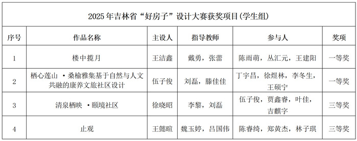 近日,由吉林省住房和城乡建设厅主办、吉林省勘察设计协会承办的2025年“好房子”设计大赛圆满落幕。学校建筑与规划学院参赛团队立足专业积淀、秉持创新思维完成设计作品,在学生组竞赛中表现优异,从93项参赛作品中脱颖而出,荣获一等奖2项、三等奖2项。此次获奖是赛事组委会对参赛学生专业能力与实践水平的认可,也集中体现了学校在教学改革、实践育人及学科建设方面的阶段性成效。