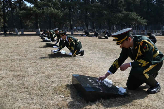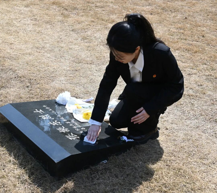 随后,师生们怀着崇敬的心情前往烈士墓区,俯身擦拭、仔细清理每一座墓碑上的尘土与杂物,以朴素而庄重的行动表达对先烈的深切追思,沉浸式接受红色思政教育。